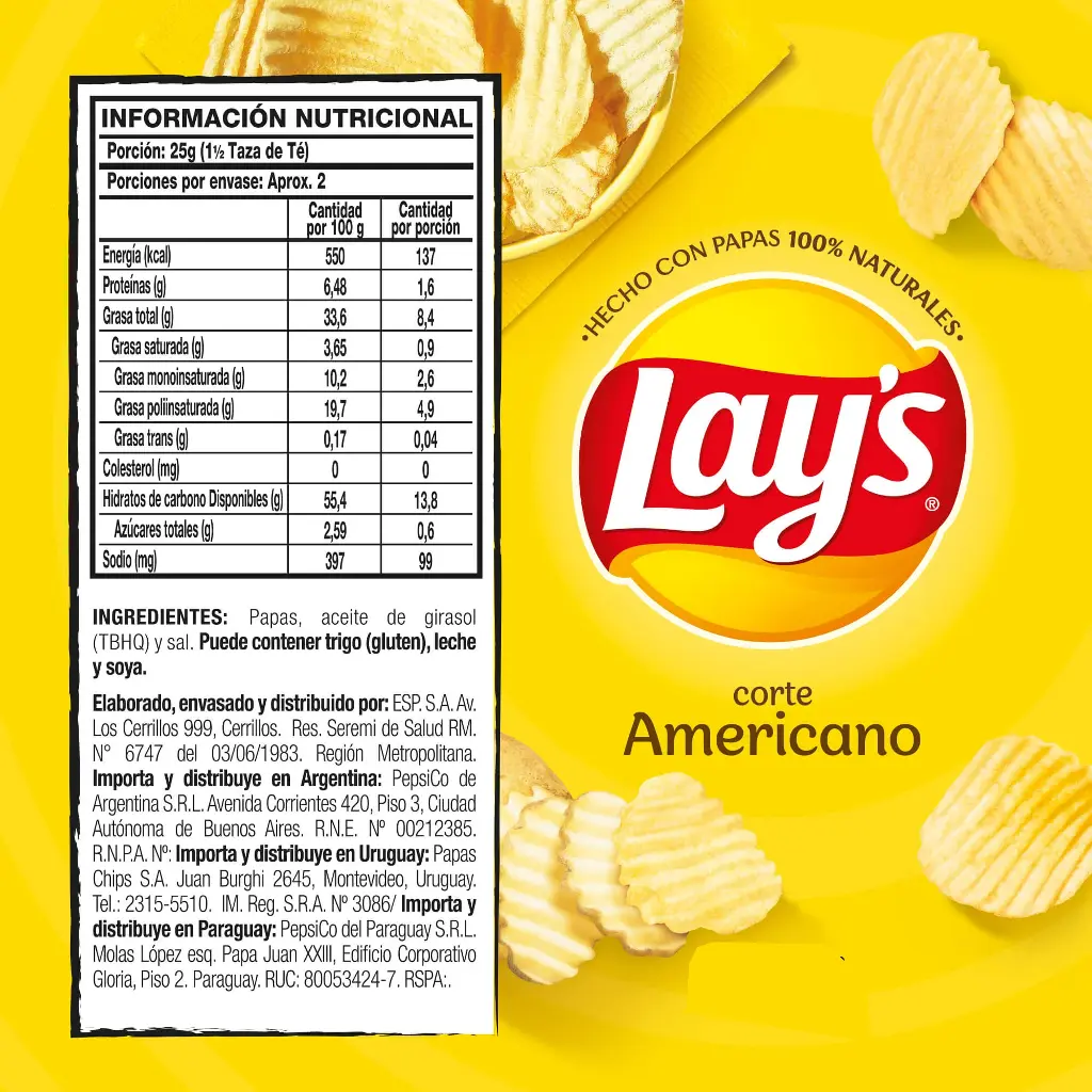 Las papas fritas Lay's Corte Americano están hechas con solo tres ingredientes: papas, aceite vegetal y sal; bajo los estándares más altos de calidad. Son sin duda el corte más clásico, más crujiente y delicioso de todos, convirtiéndolos en el snack perfecto para cualquier junta, fiesta de cumpleaños, graduación o a solas.